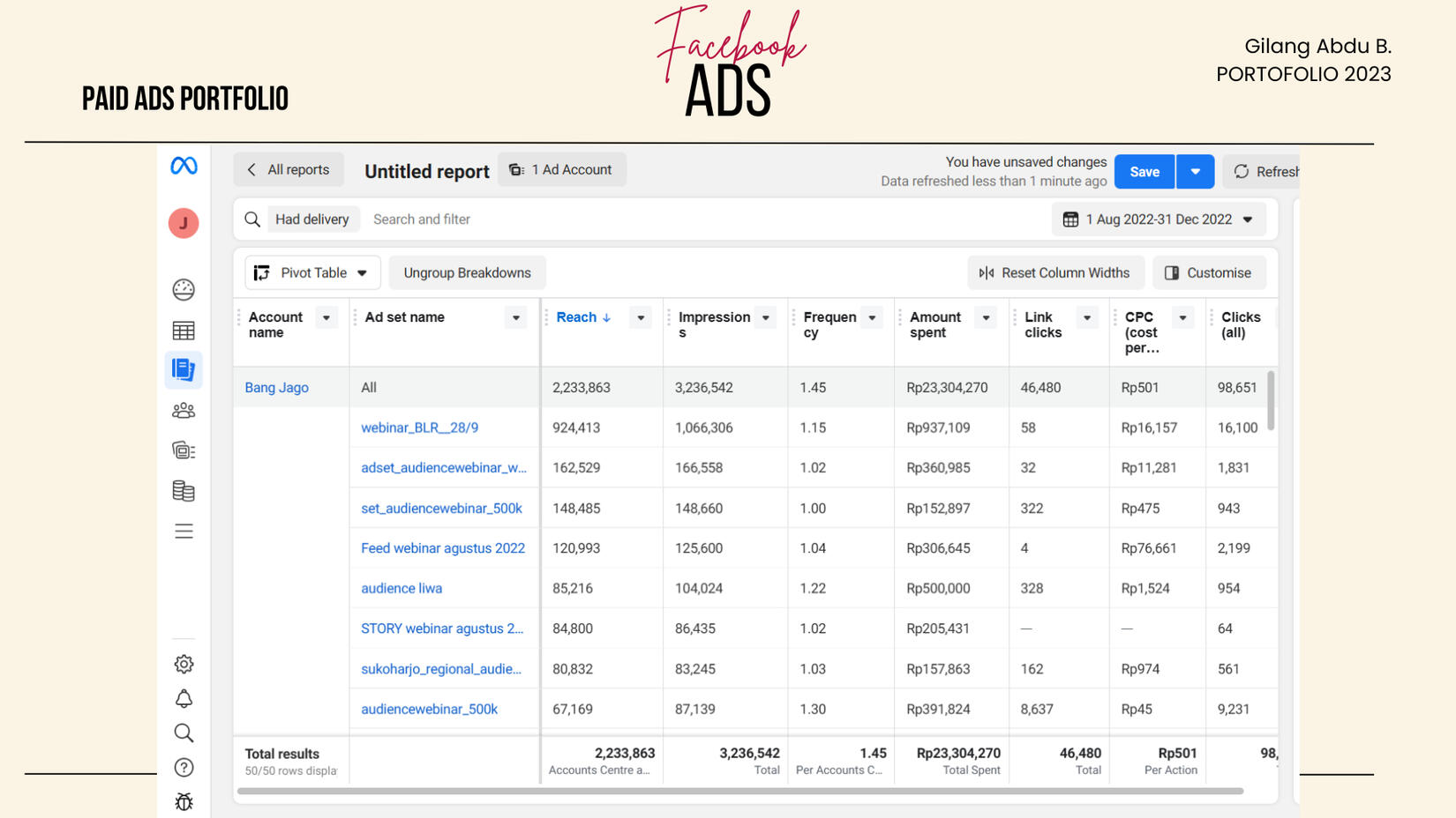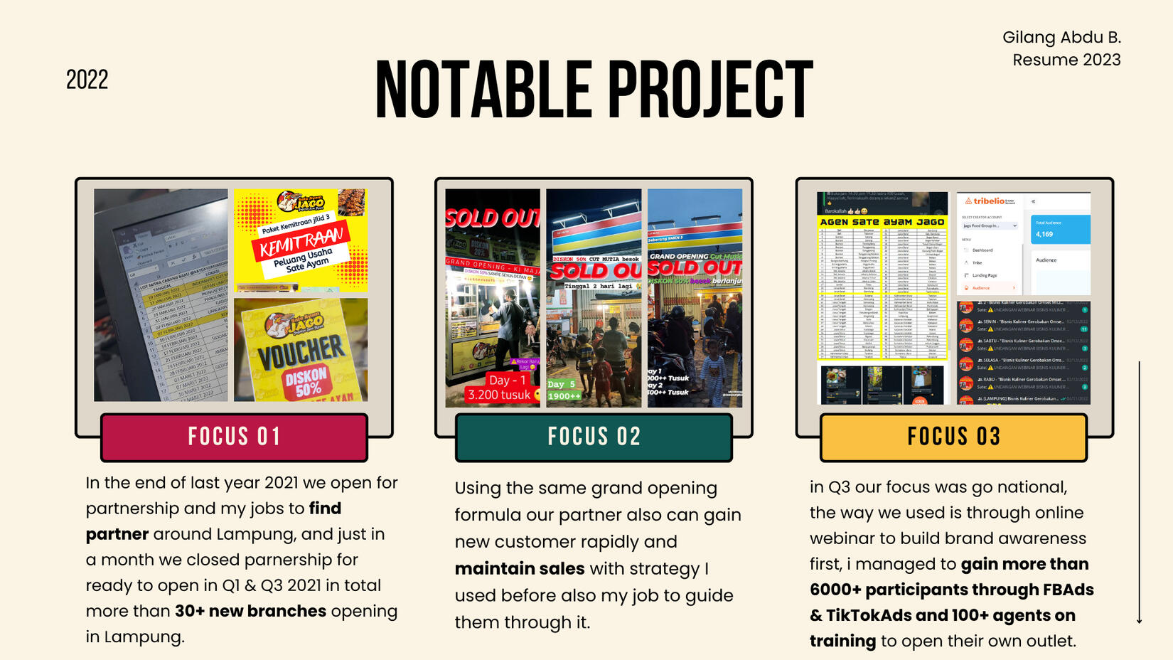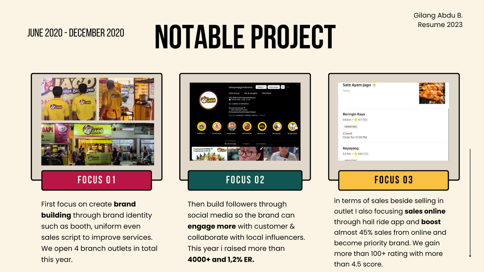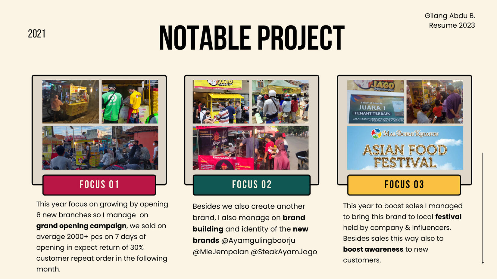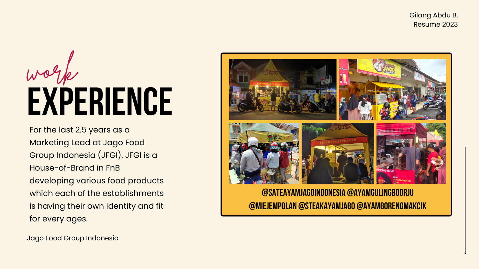 For the last 2.5 years as a Marketing Executive at Jago Food Group Indonesia (JFGI). JFGI is a House-of-Brand in FnB developing various food products which each of the establishments is having their own identity and fit for every ages.As a marketing Executive my main role was to oversee all marketing operations of the company and responsible for developing and executing marketing plans, managing campaigns, and collaborating with other teams to drive brand awareness, generate leads, and increase sales to achieving business goals.
